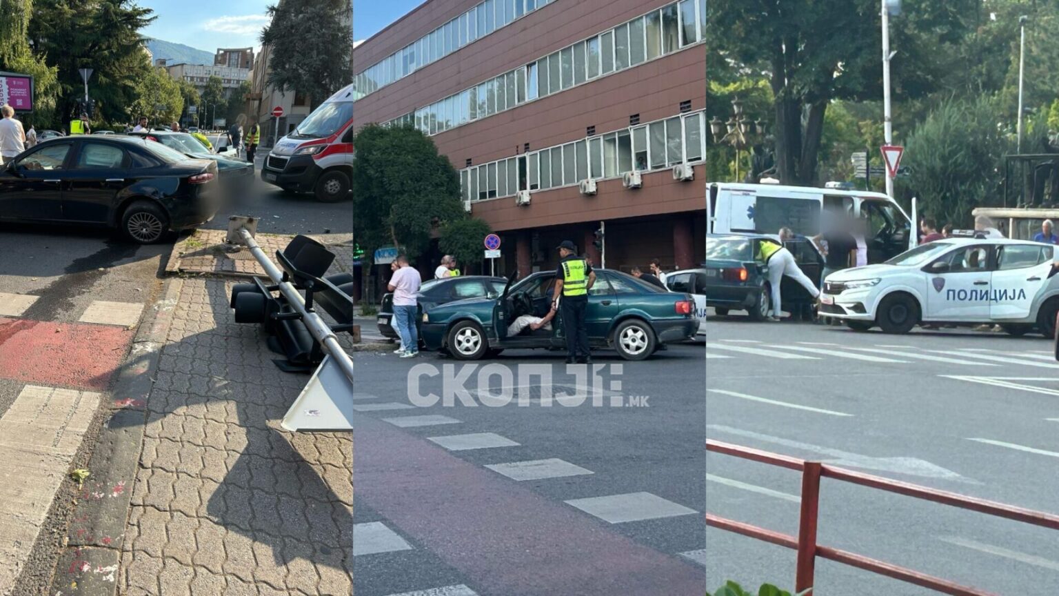 Сообраќајна несреќа се случи на раскрсницата кај Собрание. Очевидци посочуваат дека автомобил марка „ауди“ и „алфа“ се судриле, а веднаш била повикана и Брза помош бидејќи еден од возачите се жалел на повреди.Од фотографиите може да се види дека поголеми оштетувања има автомобилот „алфа“ во кои се отвориле и воздушните перничиња. Од силината на ударот, искршен е и семафорот.Повеќе детали се очекуваат од МВР.