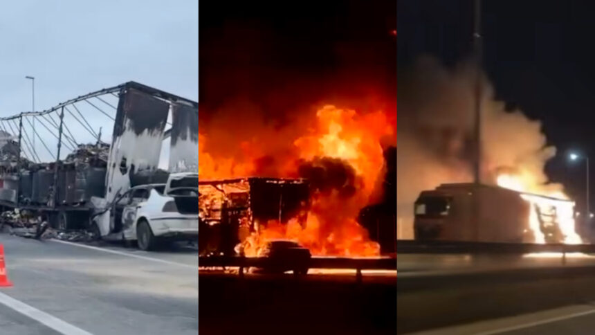 (Видео) Тешка сообраќајна несреќа на автопатот Скопје–Куманово: Две возила изгореа, едно лице тешко повредено