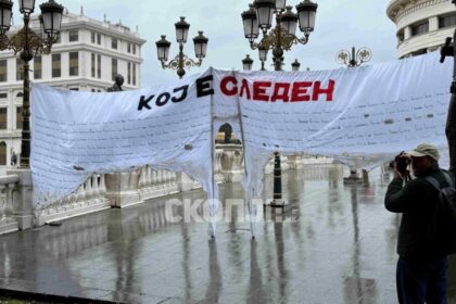 Со транспарент на кој се испишани имињата на жртви од повеќе несреќи во Македонија, и оставен простор за поминување на…